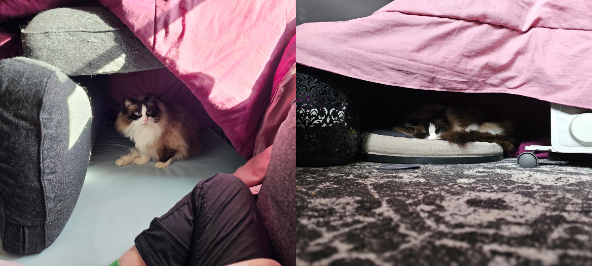 She peeked beyond the entrance briefly, to check for the gremlin. She caught a glimpse of him, but he was far from his usual pesky ways. Instead, he was fast asleep, still at the top of the cat tree where Juno had left him. She also saw both her human subjects sat on the floor beneath the cave, playing with some kind of odd human toys.