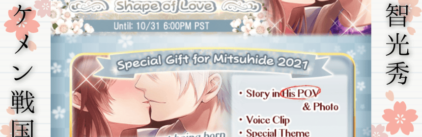 October 4th was the birthday of Ikemen Sengoku’s cunning kitsune, Akechi Mitsuhide. To celebrate, a new birthday story has been added to the store for a limited time, along with returning sets from previous years, all the way back to 2017…